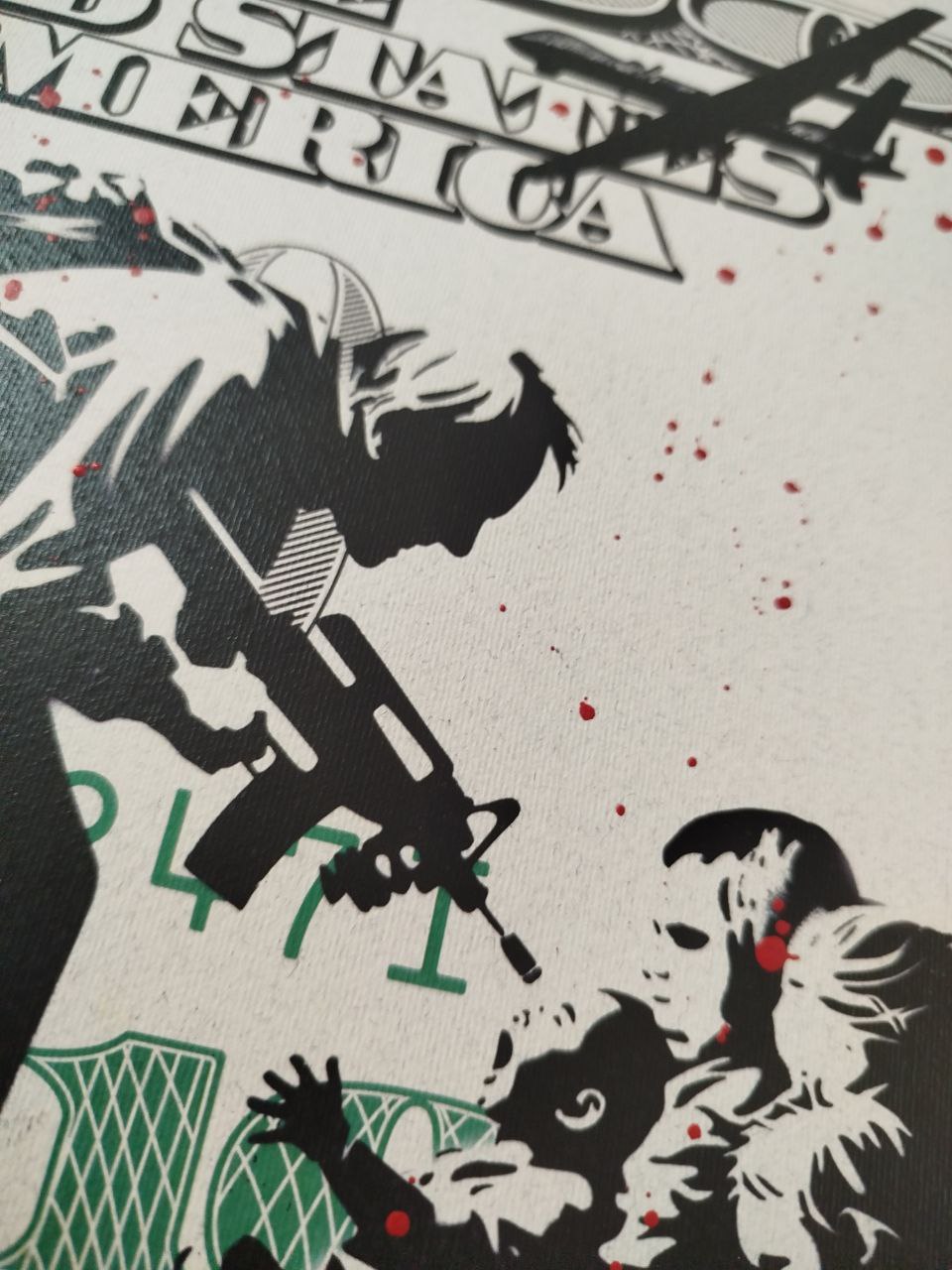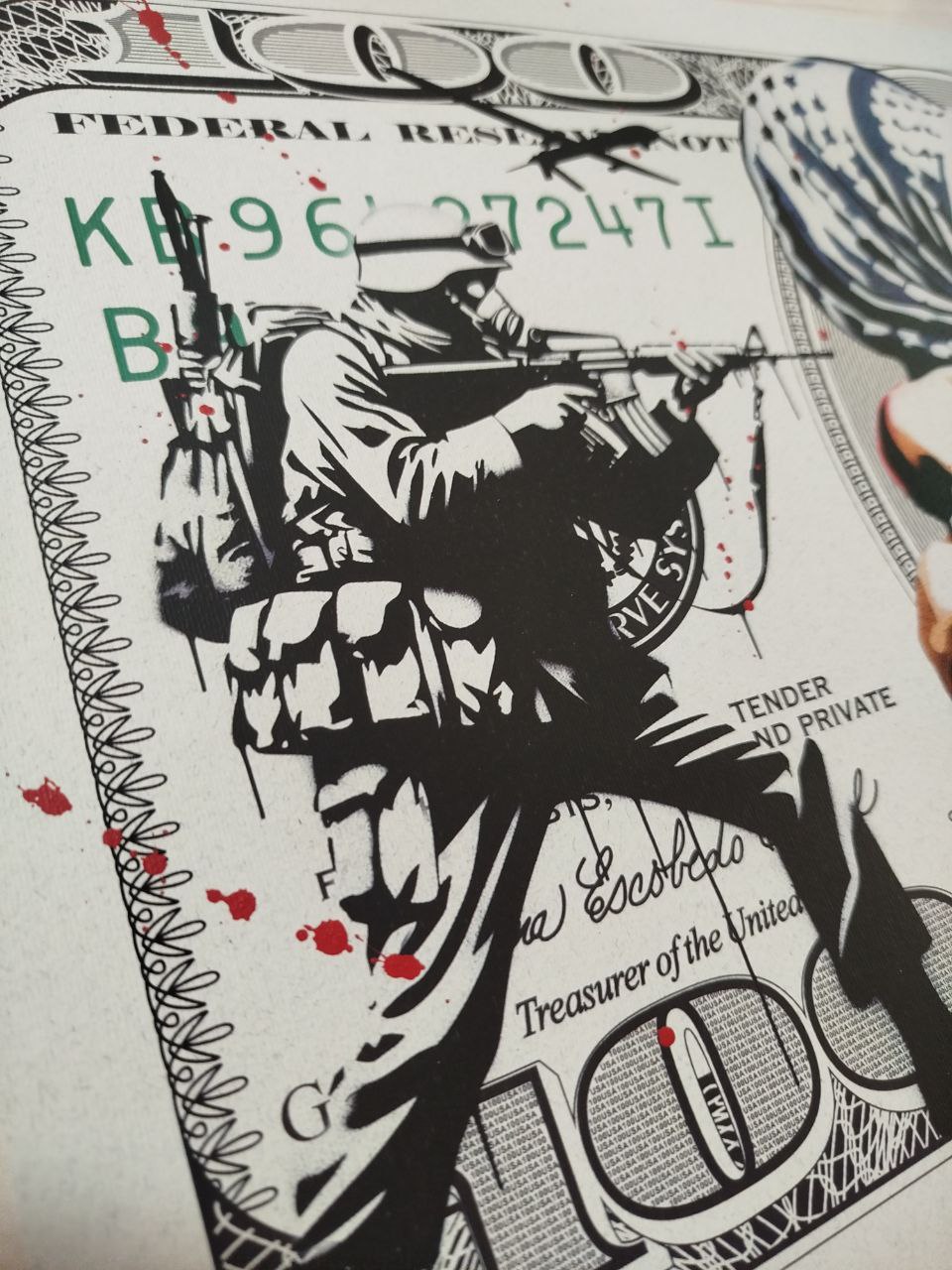 En esta obra decidí tomar el billete de cien dólares como soporte porque representa el poder económico que mueve gran parte de los conflictos armados en el mundo. Sobre ese símbolo de riqueza coloco la verdadera factura de esas guerras, la infancia.