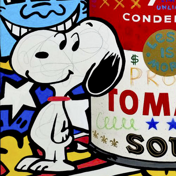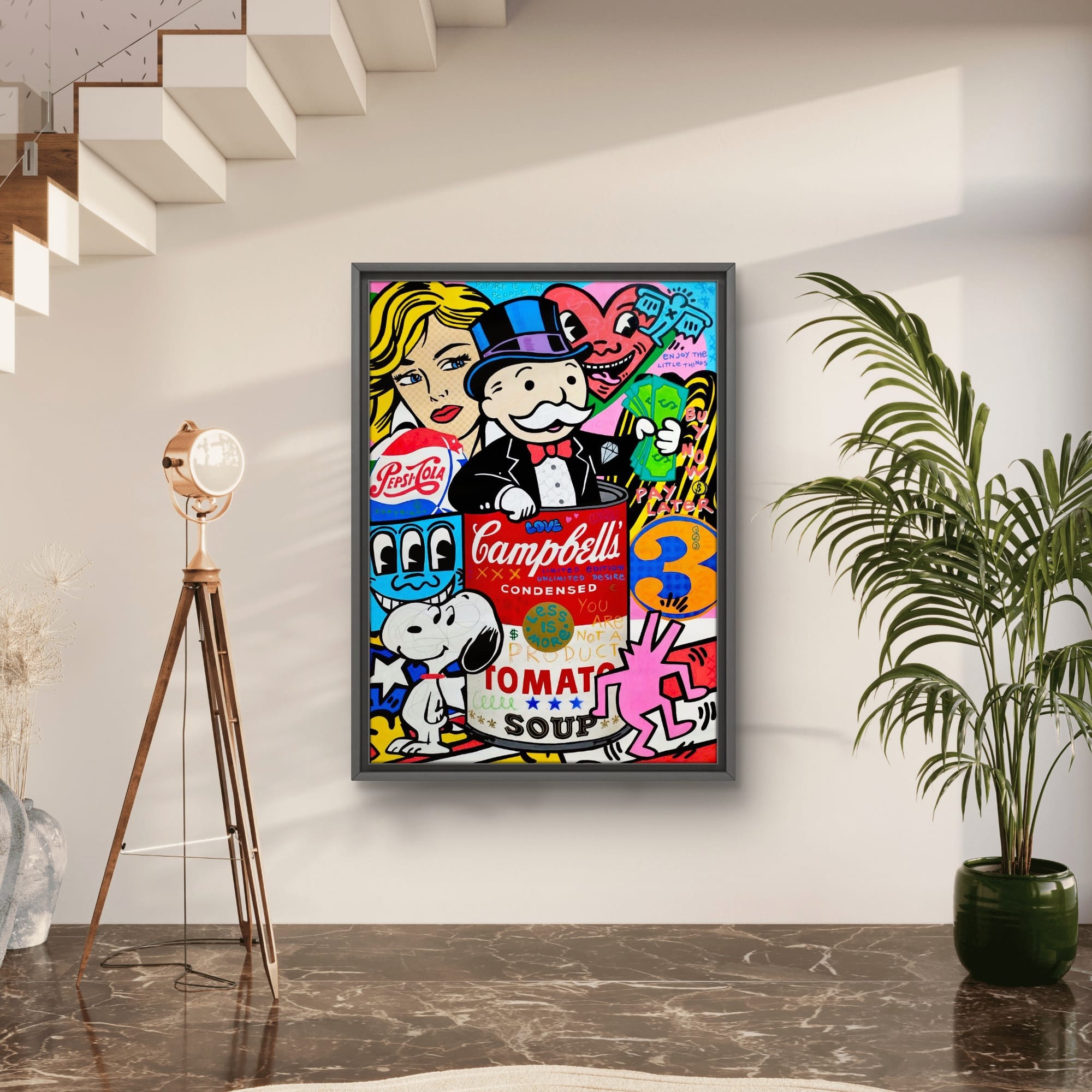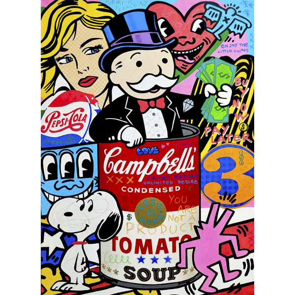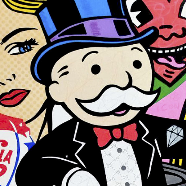 La lata de sopa Campbell’s es más que un simple objeto; es un símbolo de la cultura pop, algo que todos reconocemos y que ha sido elevado a la categoría de obra de arte. Al colocarla en el centro, estoy subrayando cómo los productos más ordinarios pueden convertirse en objetos de deseo y culto. Mr. Monopoly, emergiendo de esa lata, representa el capitalismo triunfante, el gran ganador de este juego del consumo. Es el espíritu empresarial llevado al extremo, la figura que se beneficia de nuestra obsesión por tener más y más.