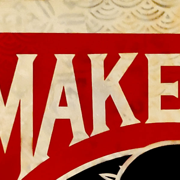 El estilo gráfico evoca el trabajo de Shepard Fairey, con su estética inspirada en el arte de los carteles de propaganda. El fondo en rojo y crema, junto con el borde decorativo de flores y formas geométricas superpuestas, hace referencia a los motivos propagandísticos tradicionales, que en este caso refuerzan el impacto visual de la obra y subrayan la ironía del mensaje. Aquí, el arte del cartel, históricamente utilizado para difundir mensajes políticos y sociales, se convierte en un vehículo para la crítica de la propia industria del entretenimiento.