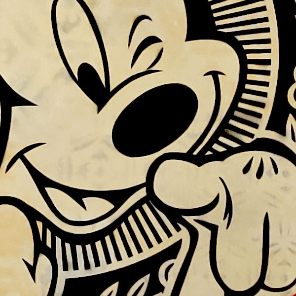Mickey Mouse, un personaje que representa la inocencia y la alegría en la cultura popular, aquí aparece realizando dos gestos ofensivos: con una mano levantando el dedo medio y con la otra apuntando al espectador, desafiándolo directamente. Este contraste entre la imagen de Mickey, que suele ser visto como un símbolo de la infancia y el entretenimiento inofensivo, y estos gestos groseros, cuestiona el papel de los símbolos de la cultura de masas en la sociedad contemporánea. Mickey ya no es solo una figura divertida, sino un instrumento para transmitir un mensaje crítico y satírico sobre el poder y la comercialización de estos iconos.