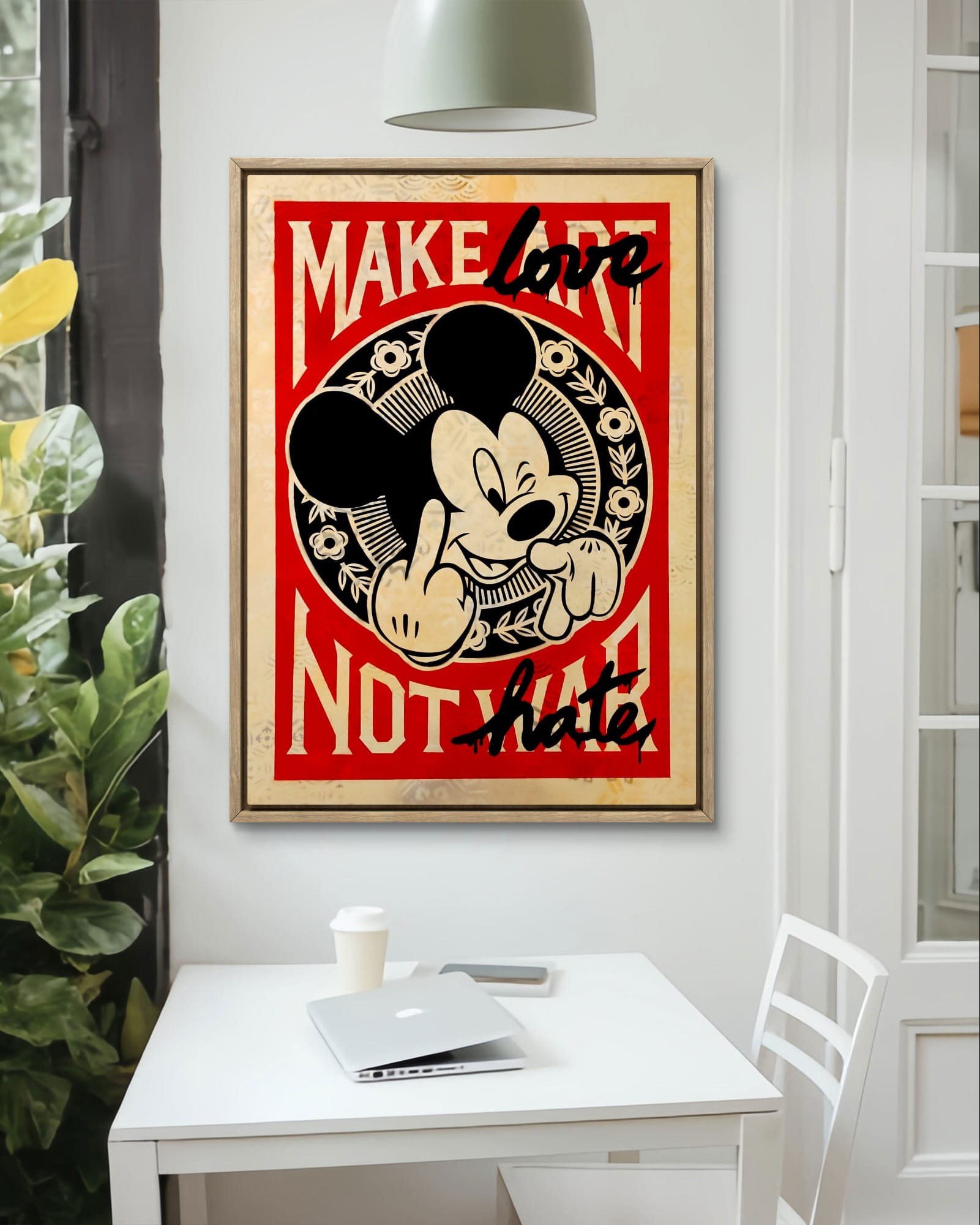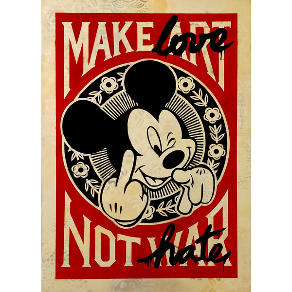 Esta obra es una sátira mordaz sobre los valores y la cultura de masas, utilizando la imagen icónica de Mickey Mouse para subvertir los mensajes tradicionales de paz y amor. A primera vista, el eslogan «MAKE LOVE NOT WAR» parece remitir a los movimientos de contracultura de los años 60, pero el mensaje es intervenido de manera disruptiva con las palabras “love” y “hate” grafiteadas, creando una contradicción intencional que refleja las tensiones entre los ideales pacifistas y la realidad de un mundo lleno de hostilidad y consumismo.