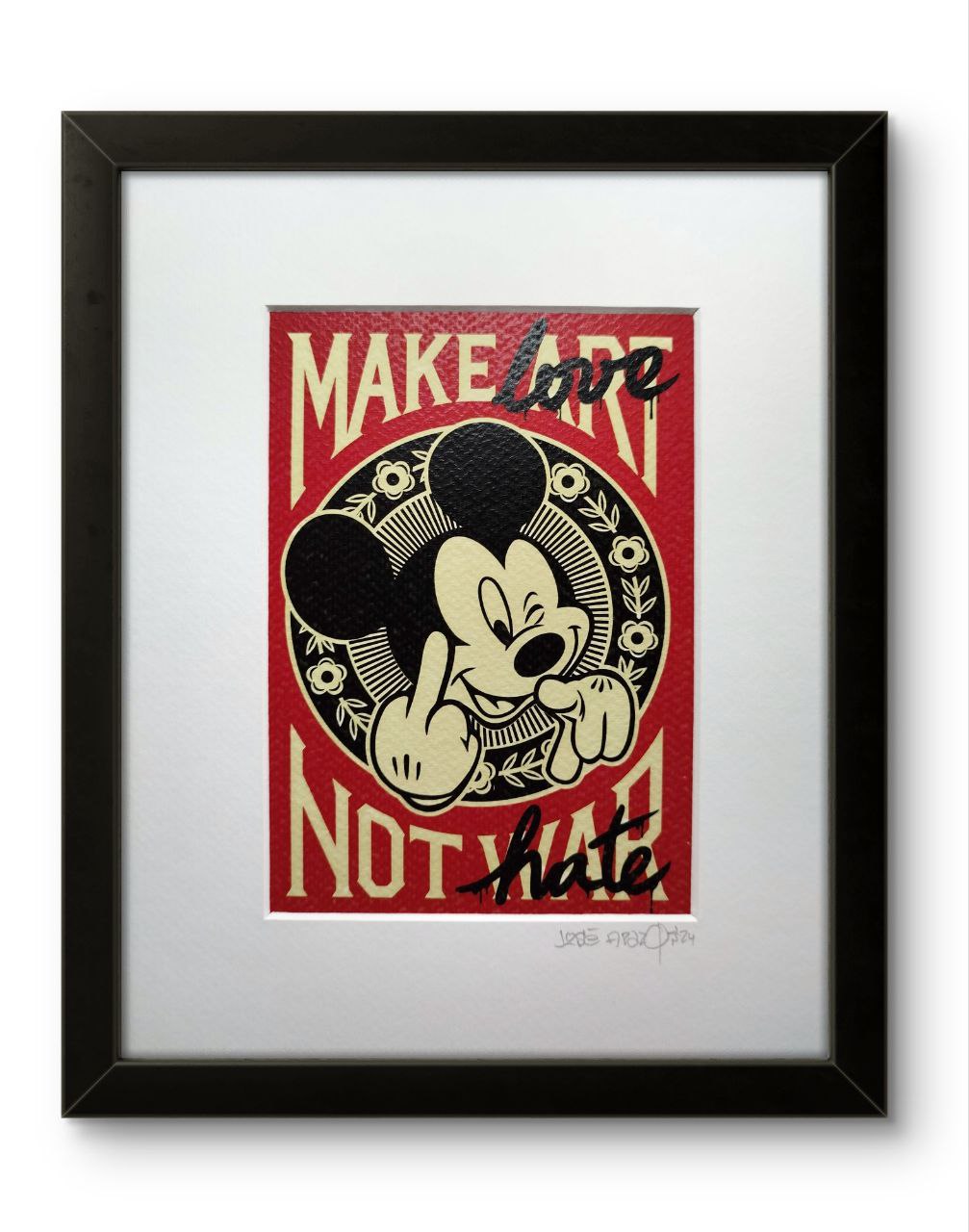Esta obra es una sátira mordaz sobre los valores y la cultura de masas, utilizando la imagen icónica de Mickey Mouse para subvertir los mensajes tradicionales de paz y amor. A primera vista, el eslogan «MAKE LOVE NOT WAR» parece remitir a los movimientos de contracultura de los años 60, pero el mensaje es intervenido de manera disruptiva con las palabras “love” y “hate” grafiteadas, creando una contradicción intencional que refleja las tensiones entre los ideales pacifistas y la realidad de un mundo lleno de hostilidad y consumismo.