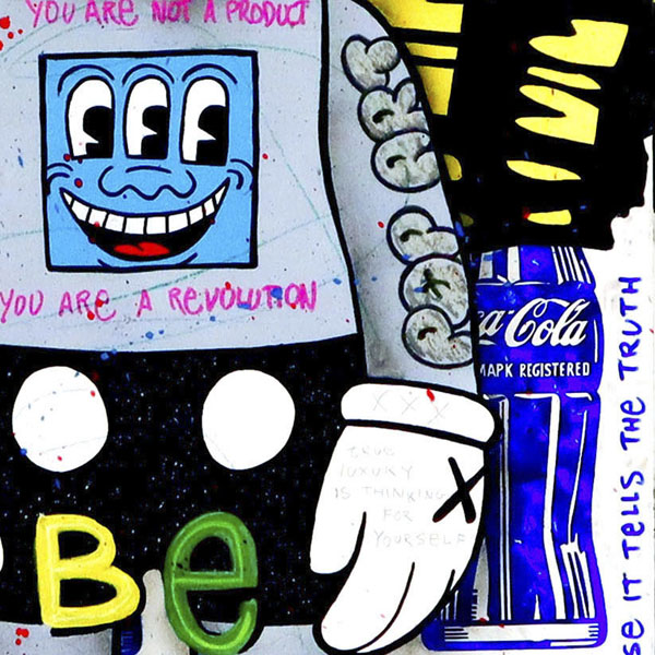 Cada personaje que aparece en la obra tiene un propósito. Mickey Mouse, al sostener una Coca-Cola, representa la comercialización de la infancia, el capitalismo disfrazado de inocencia. Es una imagen icónica que todos reconocemos, pero aquí lo coloco en un contexto diferente, como si estuviera disfrutando del sistema que nos vende felicidad efímera.