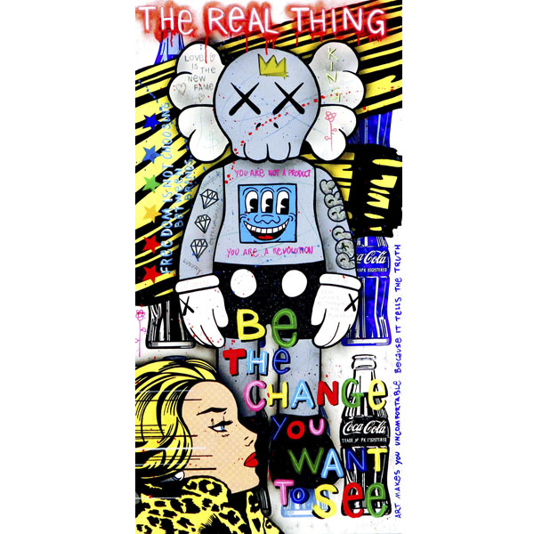 En el centro, el Companion de Kaws simboliza la contradicción entre lo adorable y lo perturbador. Sus ojos tachados evocan una especie de desconexión con la realidad, como si fuera una víctima más de la mercadotecnia y el entretenimiento desechable. Es la personificación de una generación atrapada entre el consumo y la identidad.