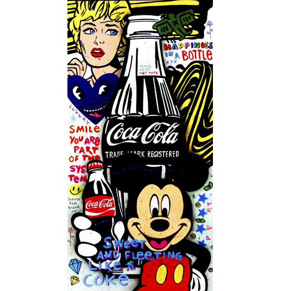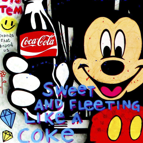 Cada personaje que aparece en la obra tiene un propósito. Mickey Mouse, al sostener una Coca-Cola, representa la comercialización de la infancia, el capitalismo disfrazado de inocencia. Es una imagen icónica que todos reconocemos, pero aquí lo coloco en un contexto diferente, como si estuviera disfrutando del sistema que nos vende felicidad efímera.