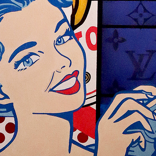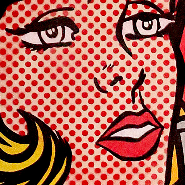A la izquierda, incluyo un rostro femenino inspirado en el estilo de cómic de Roy Lichtenstein, con su característico patrón de puntos Ben-Day. Esta mujer parece estar atrapada en una melancolía, diciendo: ‘The melody haunts my reverie’ o, en español, ‘La melodía atormenta mi ensoñación’. Me gusta el contraste que esto crea con el mensaje central de la obra: mientras el personaje de Lego sugiere un camino positivo, la mujer evoca la tristeza y el deseo de algo más, recordándonos que el crecimiento personal no siempre es fácil.