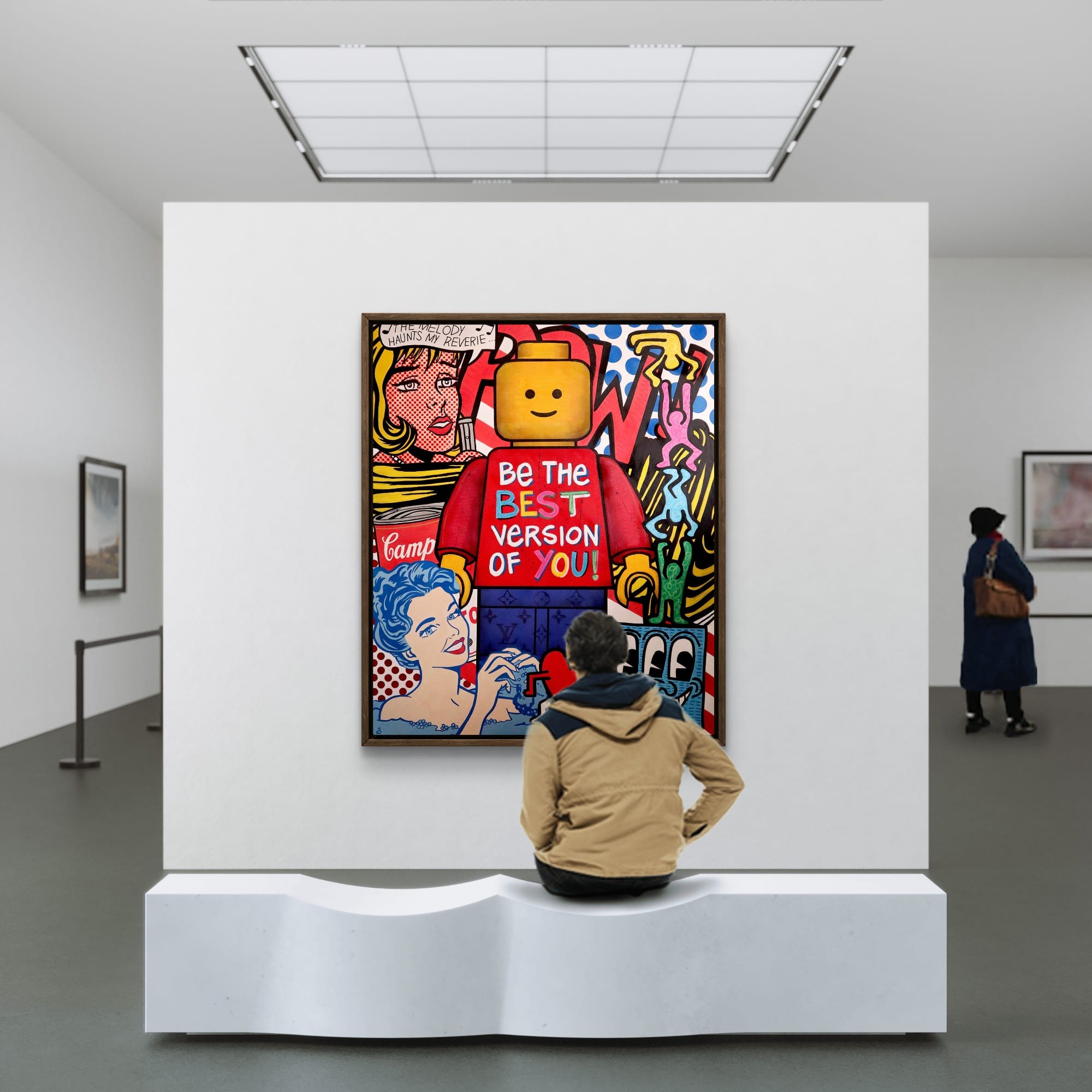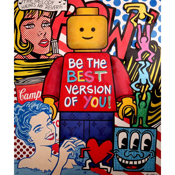 En esta obra, quise combinar varios elementos icónicos de la cultura pop para transmitir un mensaje de autenticidad y auto-motivación. El personaje central es una figura de Lego, un juguete universalmente conocido que todos podemos identificar. En su torso, escribí la frase ‘Be the BEST version of YOU!’ (Sé la MEJOR versión de TI MISMO). Es un recordatorio simple pero poderoso de que, en medio de un mundo saturado de imágenes y expectativas, debemos trabajar en ser nuestra mejor versión.