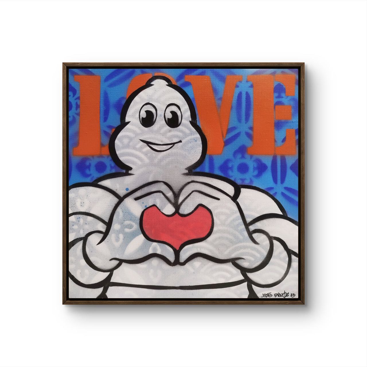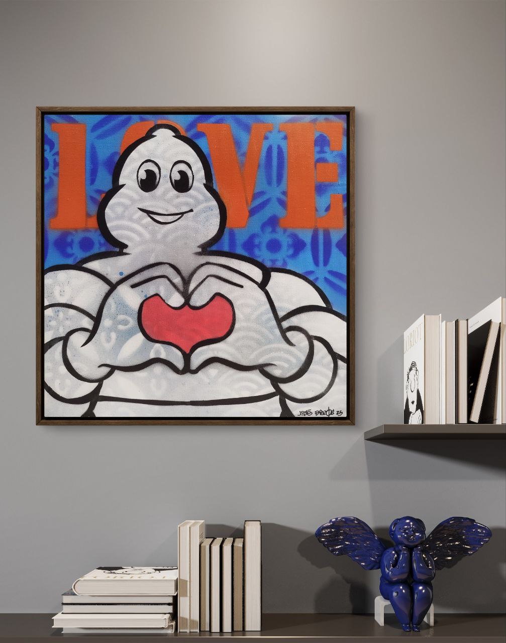 Siempre me ha fascinado cómo los íconos publicitarios pueden convertirse en símbolos emocionales, casi humanos. En esta obra utilicé al mítico muñeco Michelin, sí, ese símbolo de neumáticos, frío e industrial, y lo humanicé al máximo: lo transformé en un embajador del amor.