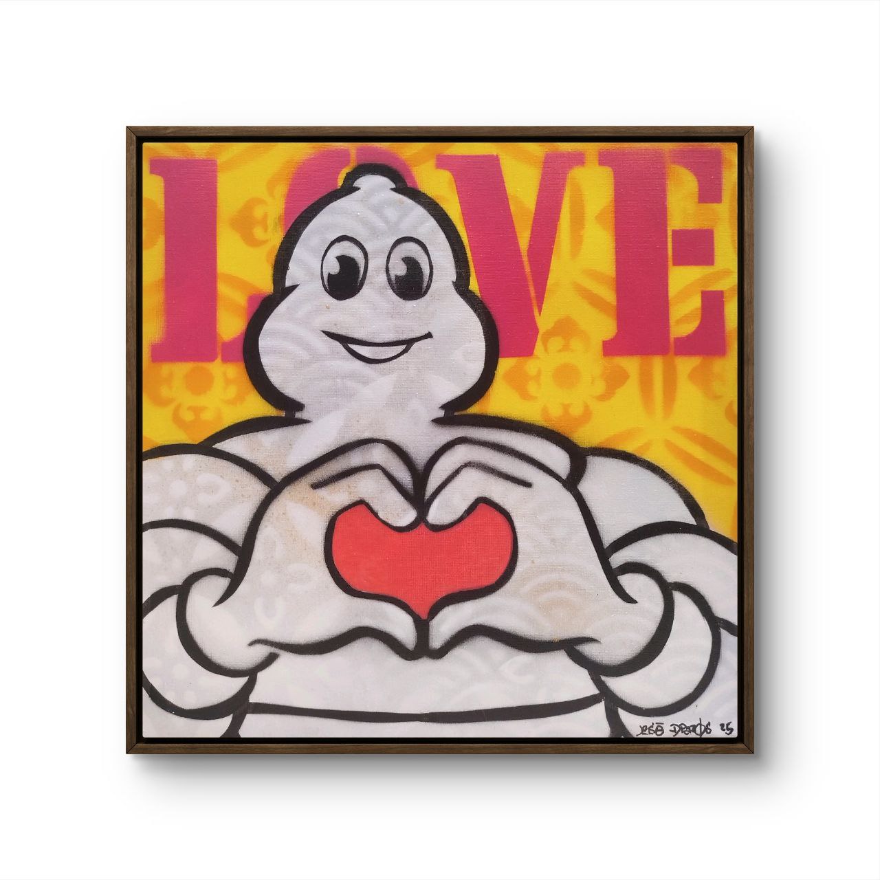Siempre me ha fascinado cómo los íconos publicitarios pueden convertirse en símbolos emocionales, casi humanos. En esta obra utilicé al mítico muñeco Michelin, sí, ese símbolo de neumáticos, frío e industrial, y lo humanicé al máximo: lo transformé en un embajador del amor.