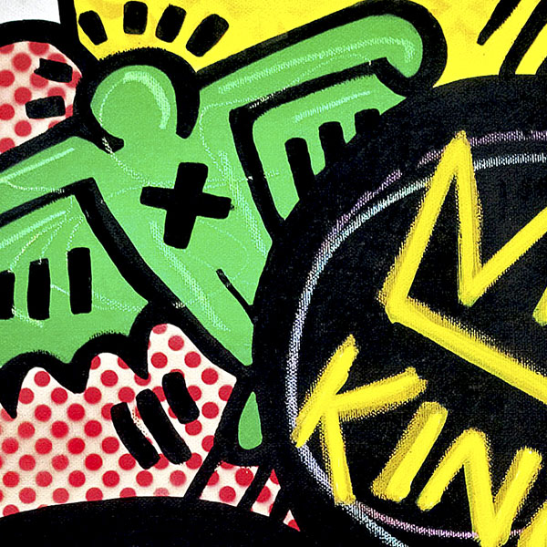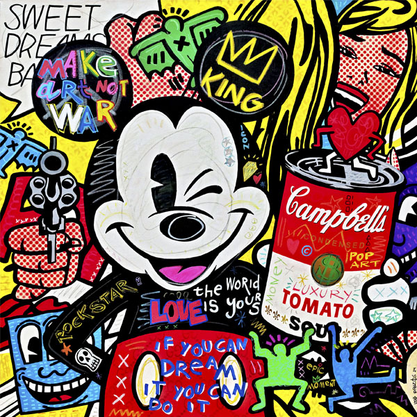 Esta obra es una explosión de color y energía, donde he querido mezclar elementos icónicos de la cultura pop con mensajes poderosos. El personaje central, inspirado en Mickey Mouse, representa una figura familiar, pero lo he reinterpretado de forma contemporánea y rebelde, para cuestionar las nociones tradicionales de lo que consideramos «arte». Su sonrisa exagerada es irónica, una crítica a la comercialización de los símbolos que consumimos todos los días.