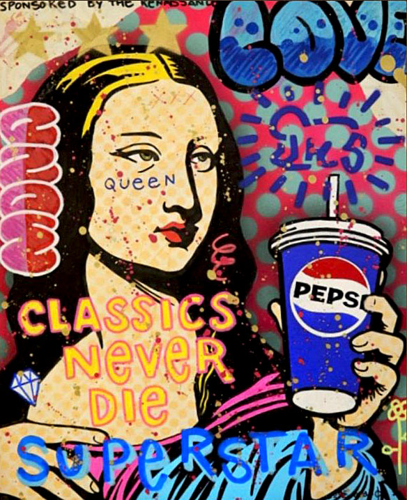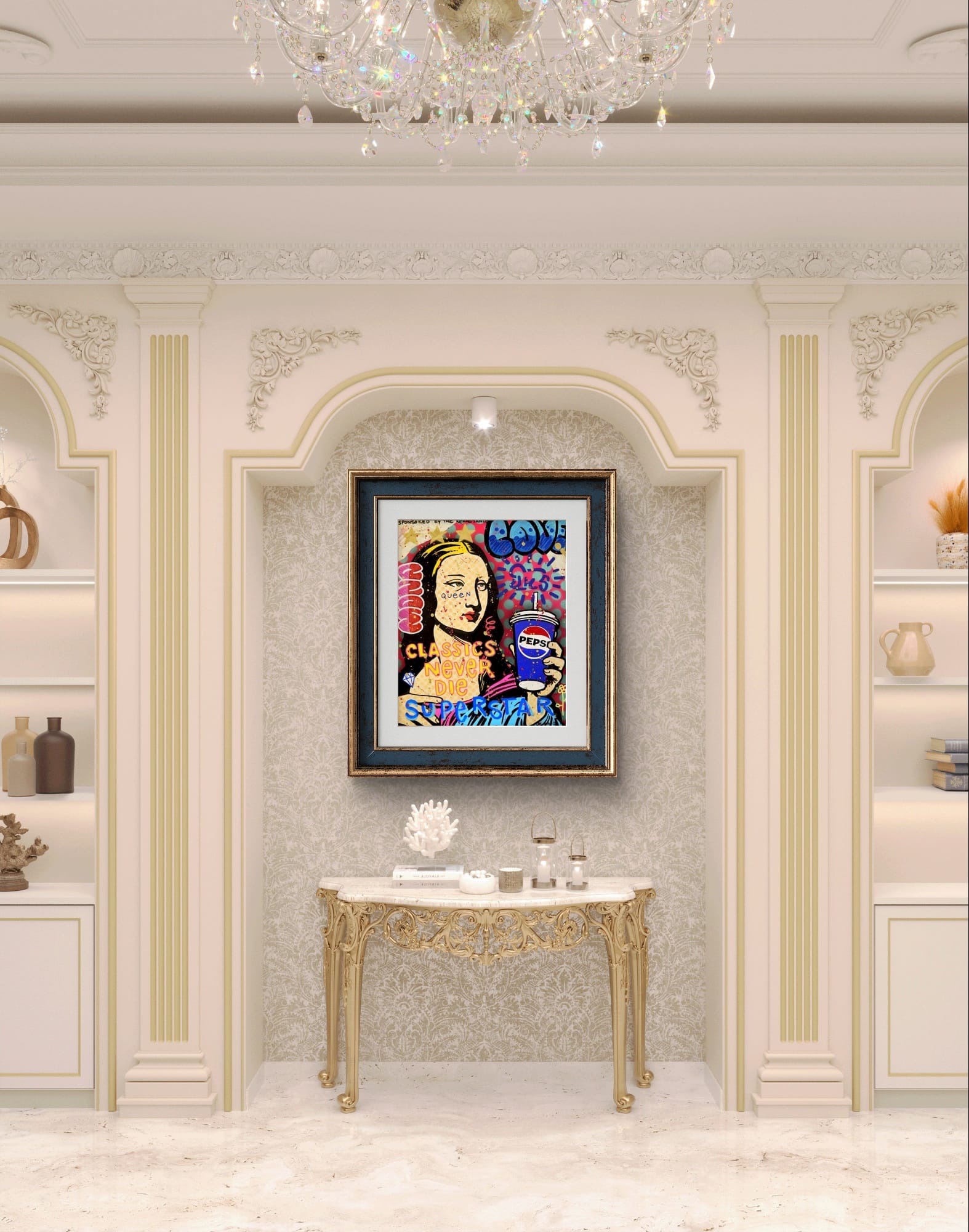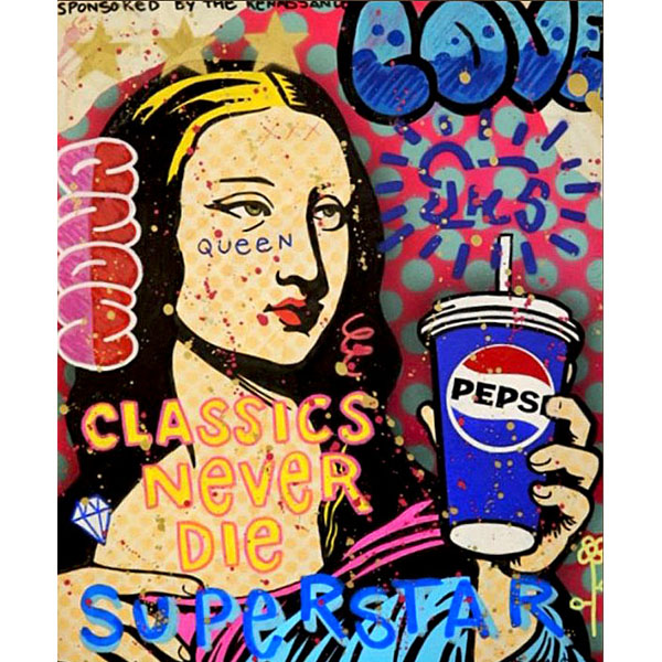 He tomado a la Mona Lisa, la obra más icónica del arte occidental, y la he sacado de su mundo renacentista para traerla a la era del consumo y la publicidad donde, en lugar de su enigmática sonrisa original, ahora la vemos rodeada de colores vibrantes, graffiti y tipografías urbanas, como si hubiera sido absorbida por la estética del arte callejero y la cultura pop, pero lo más llamativo es lo que sostiene en su mano, un vaso de Pepsi, un objeto completamente mundano y representativo de la globalización y la cultura del marketing, con el que quiero provocar una reflexión sobre qué pasaría si los grandes íconos del arte fueran convertidos en productos de consumo masivo.