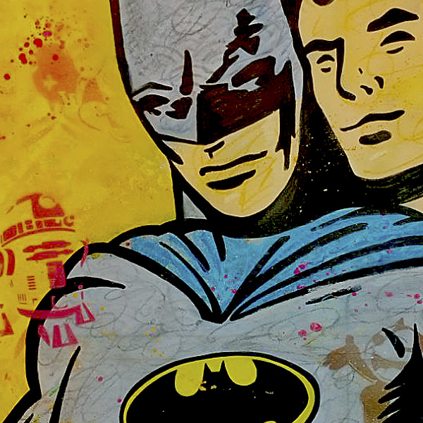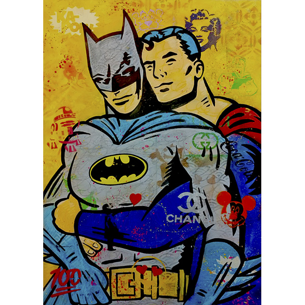 En esta obra exploro conceptos de identidad, cultura popular y el significado del heroísmo en la sociedad moderna a través de la imagen de dos de los superhéroes más icónicos de la cultura del cómic: Batman y Superman. Al presentarlos en una pose íntima y afectuosa, abrazándose de una manera que podría interpretarse como amorosa o cercana, desafío las convenciones tradicionales sobre la masculinidad y el heroísmo.