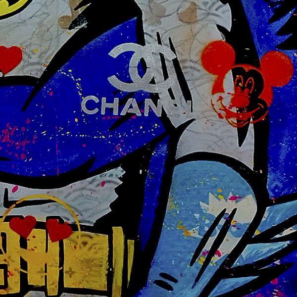 Todo lo que rodea a los personajes también tiene un propósito. Los logos de marcas de lujo como Gucci y Chanel están ahí como una crítica a cómo la cultura ha absorbido hasta a nuestros héroes, convirtiéndolos en productos. El Mickey Mouse que aparece también juega con esa idea: todo, desde los personajes de cómic hasta los iconos del entretenimiento como Marilyn Monroe, ha sido comercializado hasta el punto de perder parte de su significado original. Esta obra refleja cómo las marcas, los héroes y los símbolos de la cultura popular están entrelazados, formando parte de este mundo saturado de consumismo.