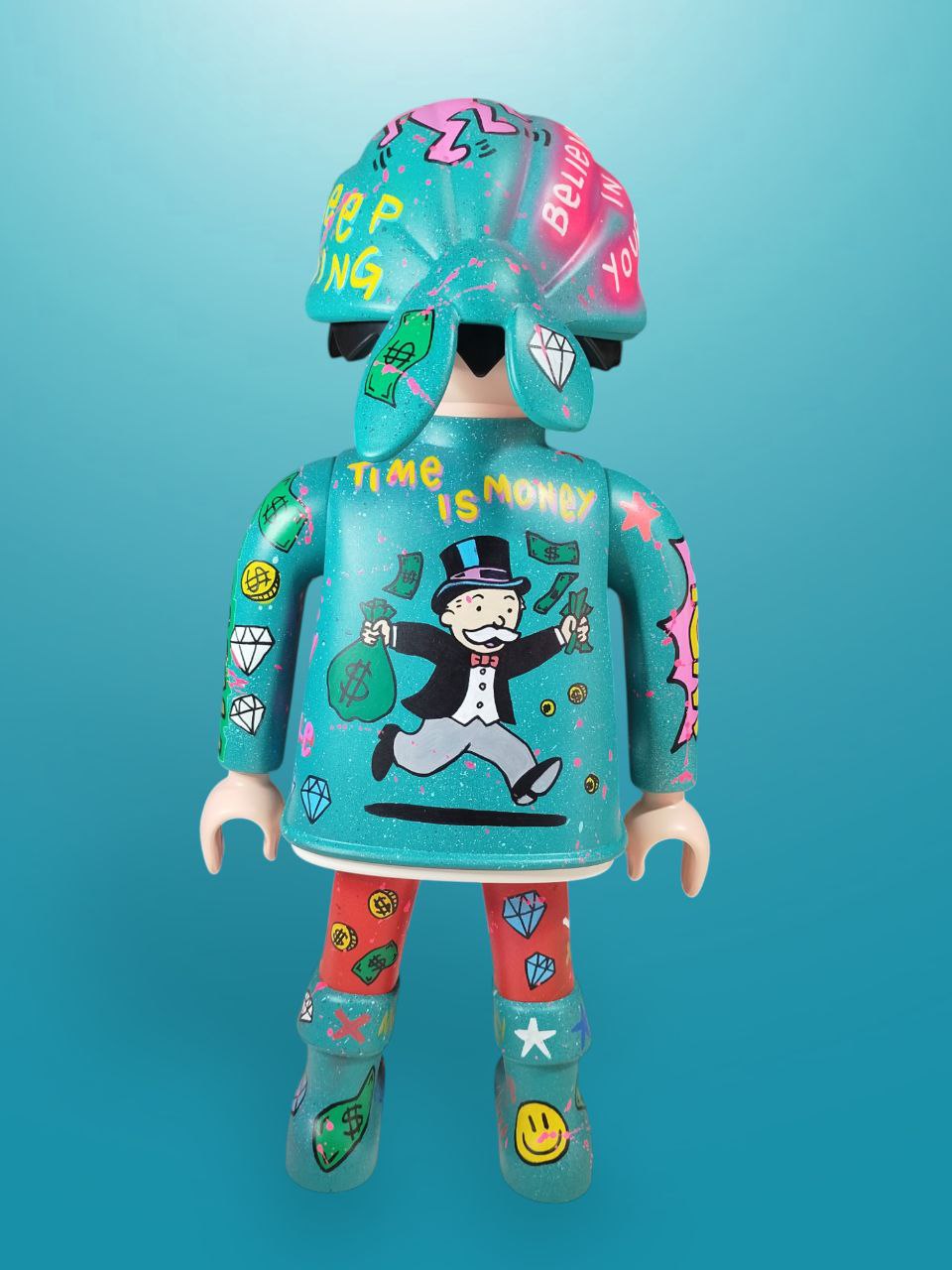 Trabajo con los clásicos Playmobil para darles una nueva vida. Me encanta coger estas figuras tan icónicas y transformarlas usando distintas técnicas y materiales, mezclando lo tradicional con lo contemporáneo. Para mí, los Playmobil son mucho más que simples juguetes; son piezas que cuentan historias nuevas y exploran temas como la identidad, el consumo y la memoria colectiva. Cada intervención es una forma de jugar y al mismo tiempo de hacer pensar, invitando a quien las vea a descubrir algo más allá de lo evidente.