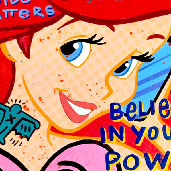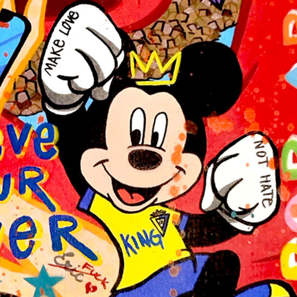El punto de partida fueron personajes icónicos como Ariel y Mickey Mouse, figuras universales que todos reconocemos, pero que aquí adquieren un nuevo significado. Ariel, con su historia de lucha por encontrar su voz, encarna la importancia de expresarnos y ser fieles a nosotros mismos. Por eso, el mensaje ‘Your voice matters’ (Tu voz importa) se asocia a ella, como un recordatorio de que cada voz tiene un valor único. Mickey, por su parte, aparece con una corona y el mensaje ‘Make love, not hate’ (Haz el amor, no el odio), representando la creatividad y el amor como herramientas transformadoras. Además, lo vestí con la equipación del Cádiz Club de Fútbol, un guiño especial a mi vínculo con Cádiz, una ciudad llena de alma, historia y resiliencia.